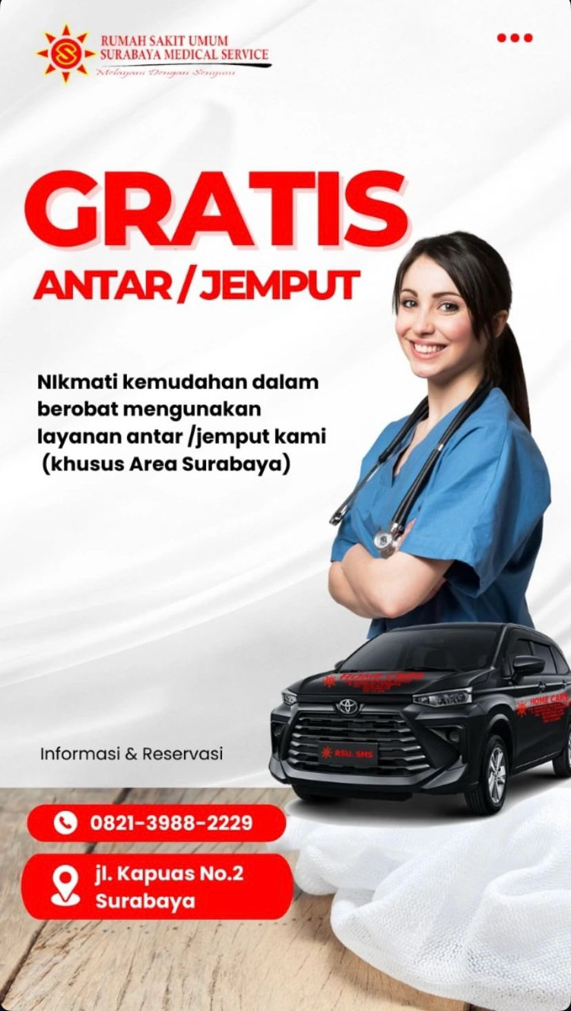 RS Surabaya Medical Service (RS SMS) menyediakan ayanan Antar/Jemput Area Surabaya & Sekitarnya. Layanan ini memberikan kemudahan kenyamanan dan waktu yang lebih Cepat untuk anda tanpa dipungut biaya sepeserpun.